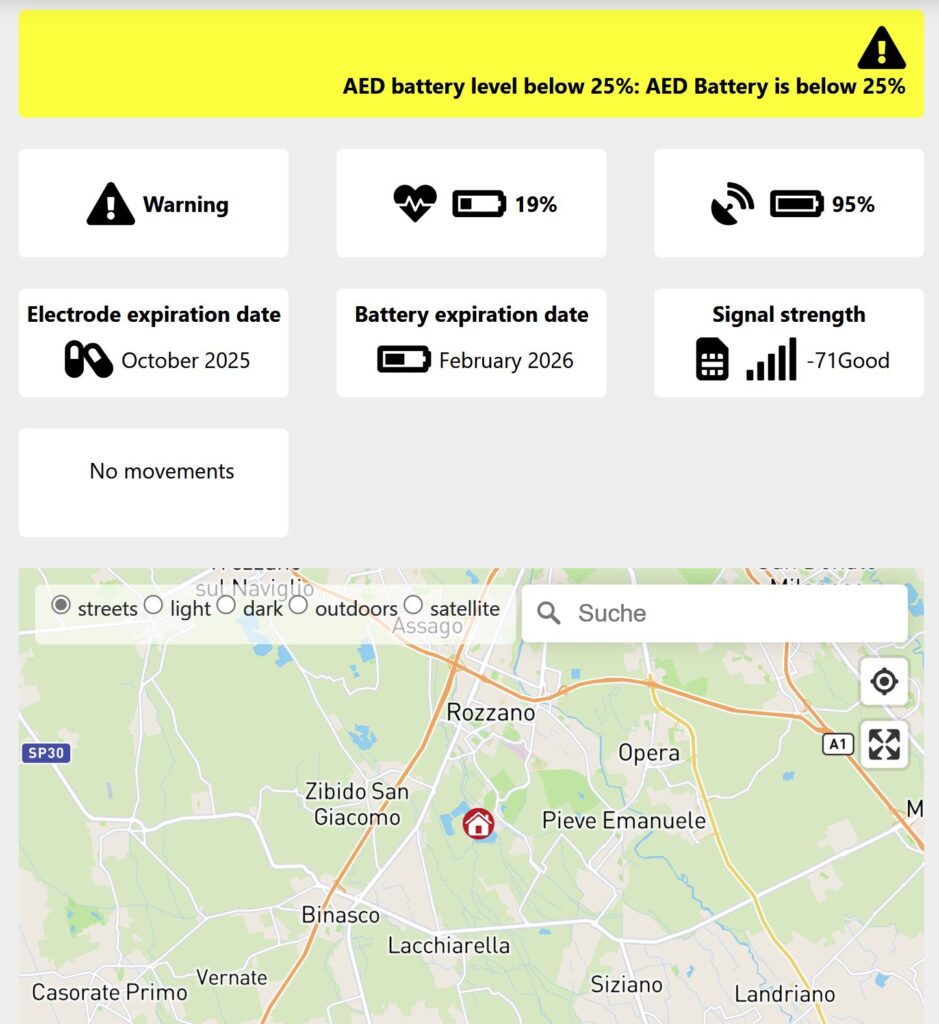 The keyword here is AED state: Two seemingly identical AEDs can be in very different states of operation and maintenance. Imagine two visually identical devices, sitting next to each other, both indicating their readiness (which is done in different ways by different vendors, an example could be a green LED blinking or the word OK on a small screen). Although the two devices you imagine seem to be identical, their batteries can be in very different states. Wouldn’t it be tremendous to have access to their exact battery percentage at a glance? What about their service and maintenance records, or the expiration date of the electrodes?
